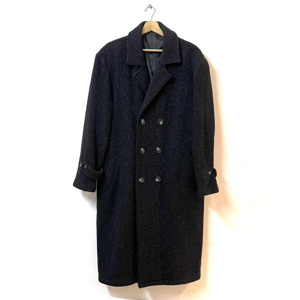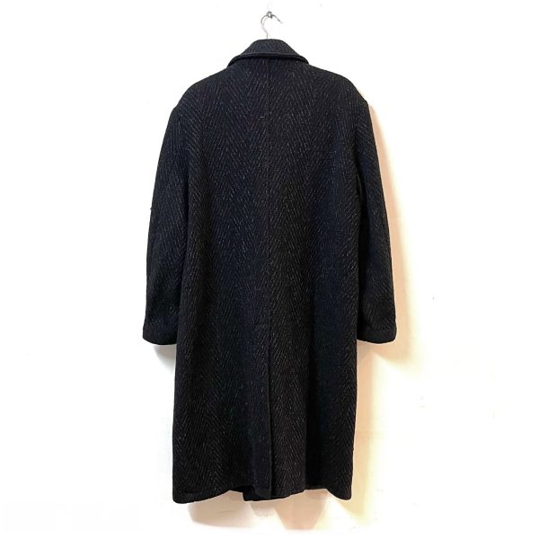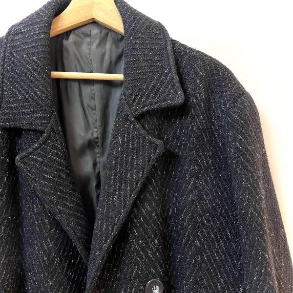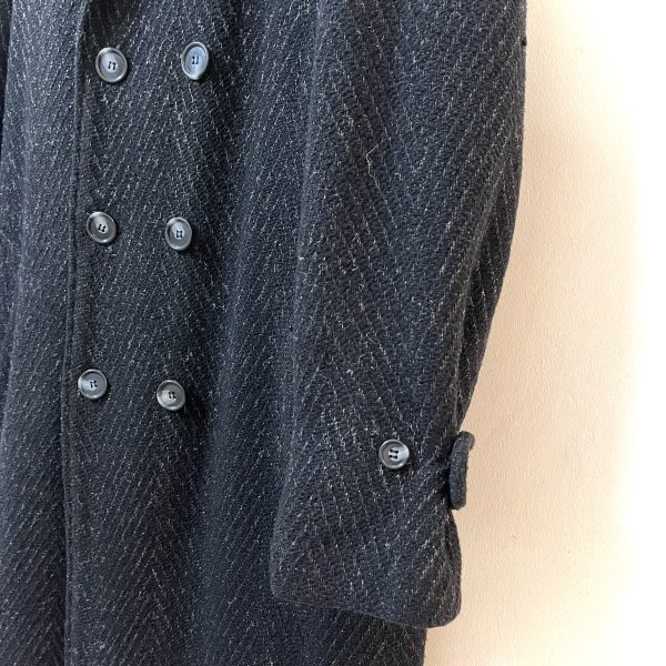 Maxi abrigo. Tela en paño grueso. Diseño espina de pez. Color negro y gris jaspe. Tiene forro interno sencillo. (El servicio de lavandería esta incluido)