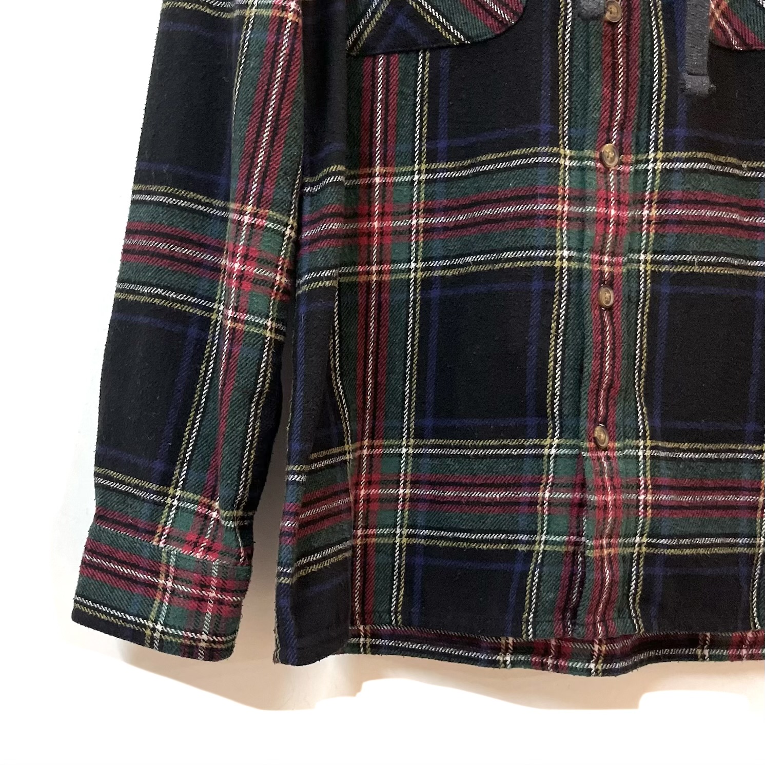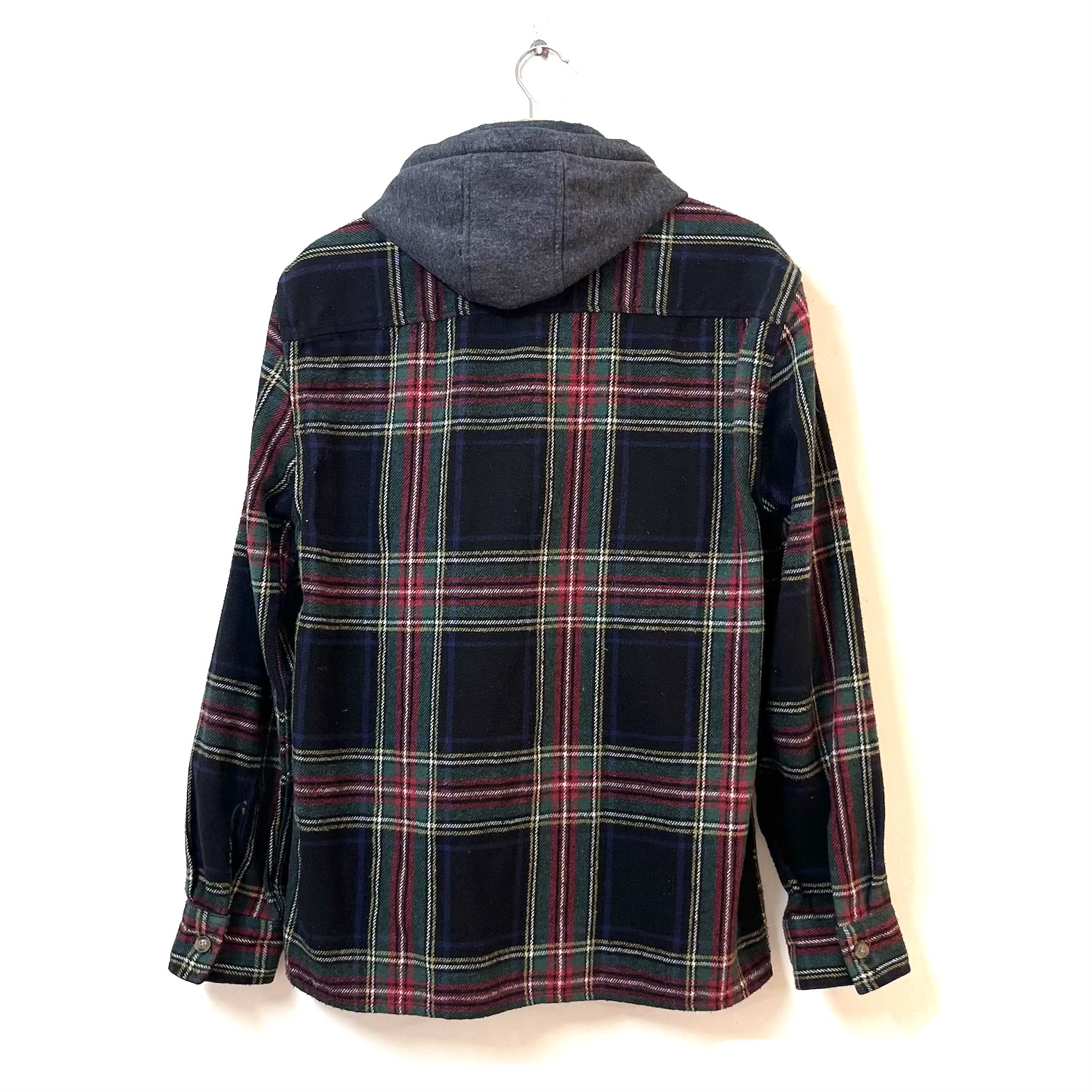 Sobre camisa a cuadros estilo leñadora con capota. Colores en líneas rojas, amarilla, blancas y negras.  Tela en paño (es gruesita), tiene textura.