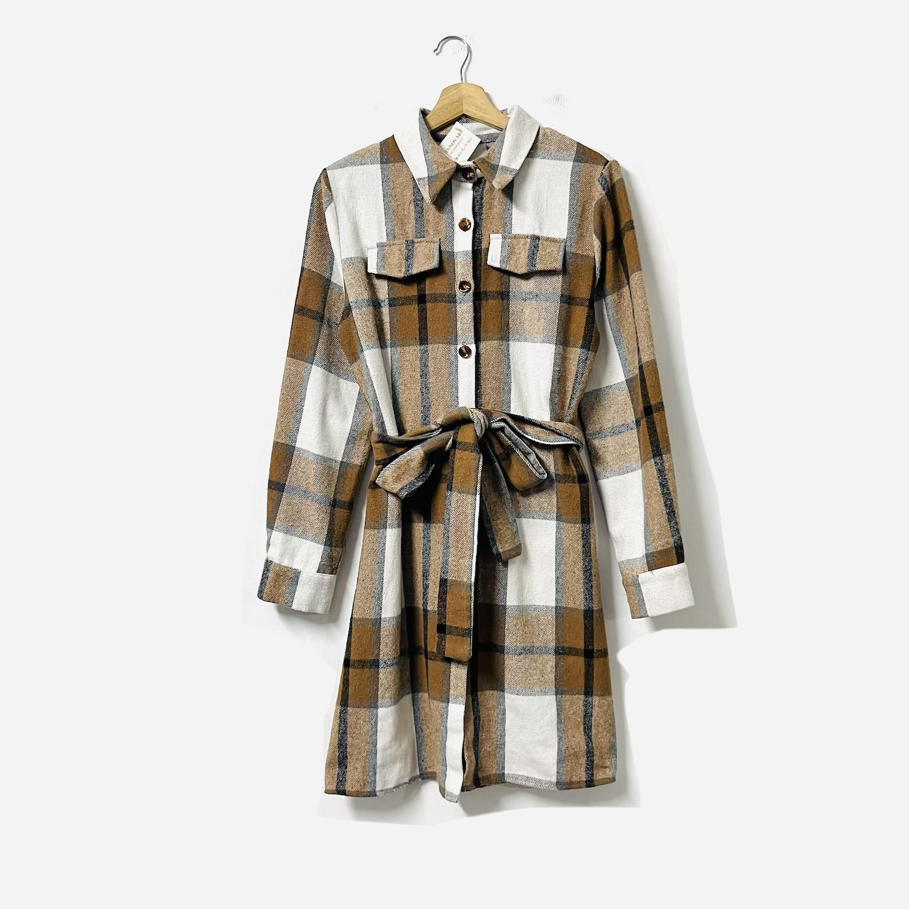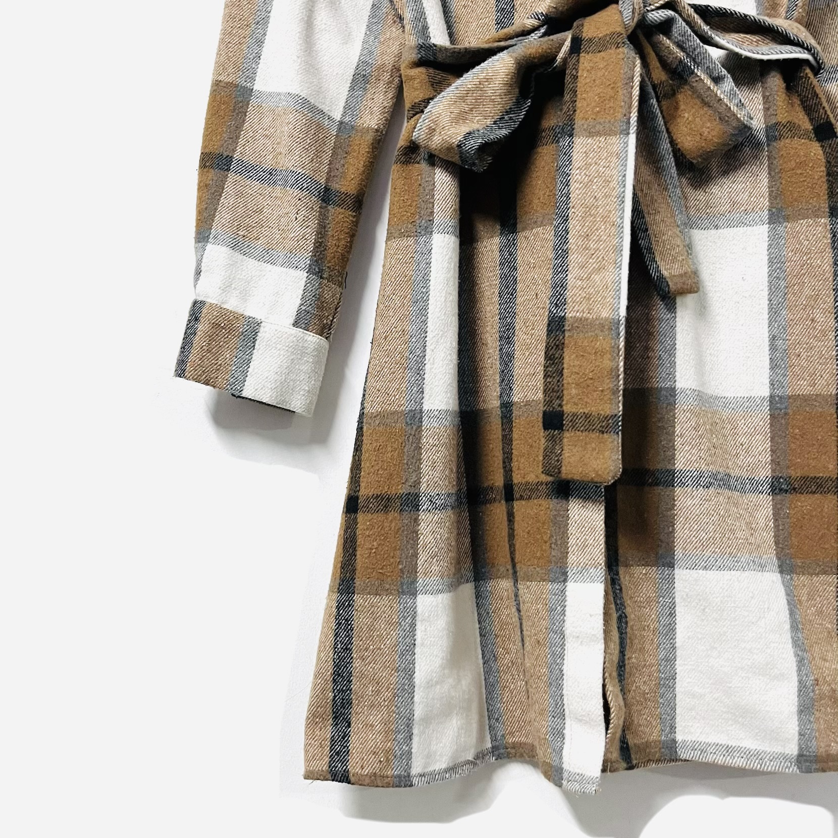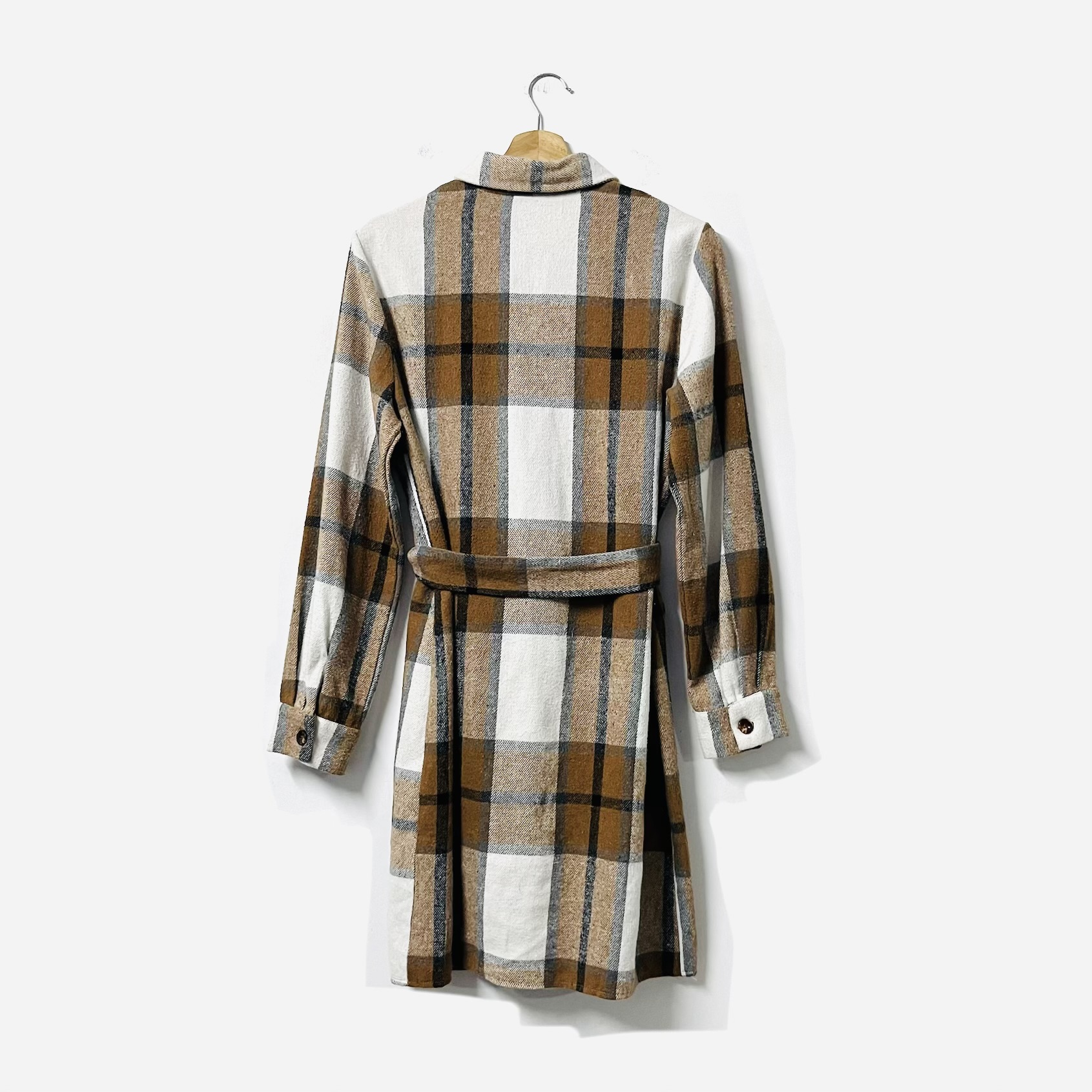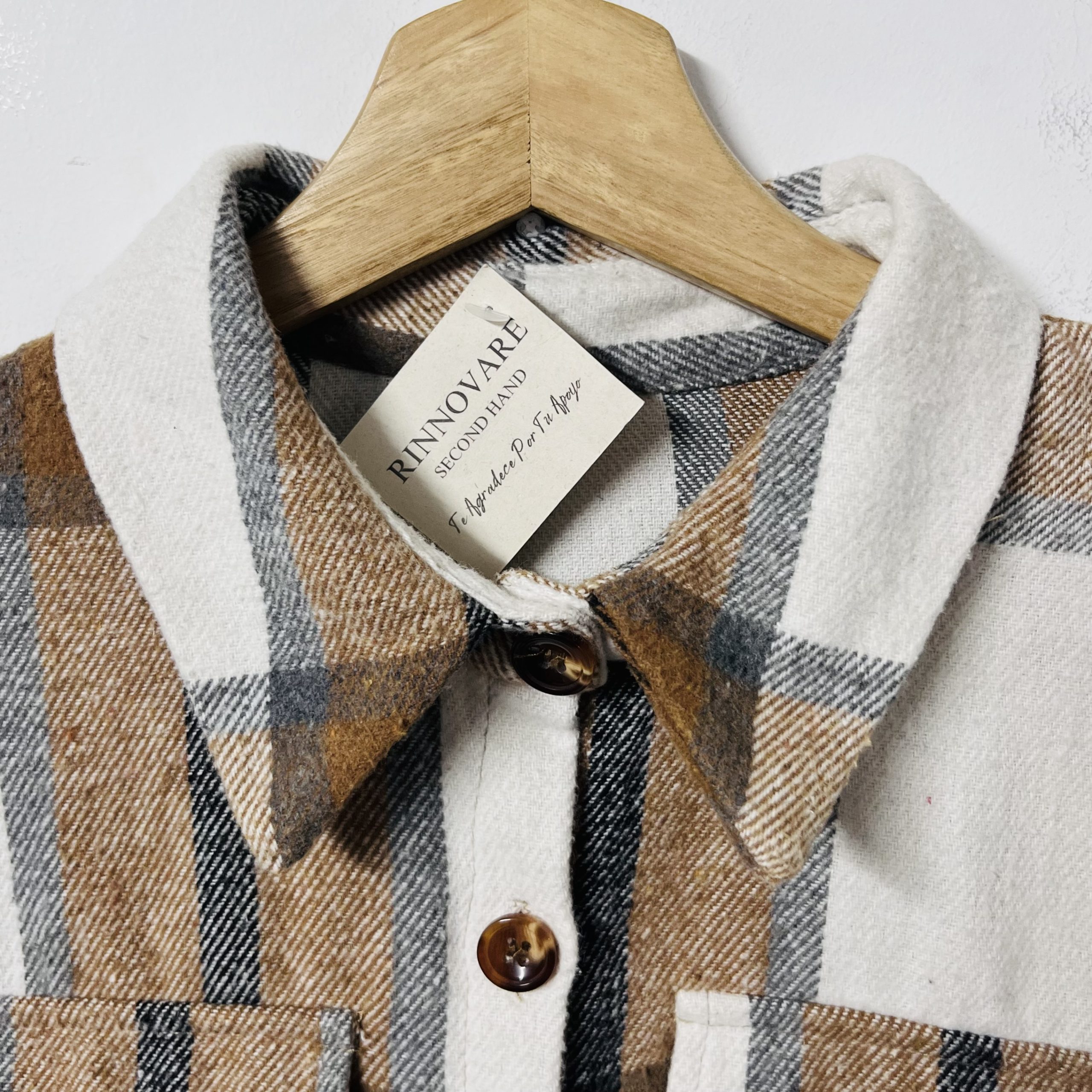 Sobre camisa a cuadros con listón. Color café, negro y blanco. Tela en paño ligero.