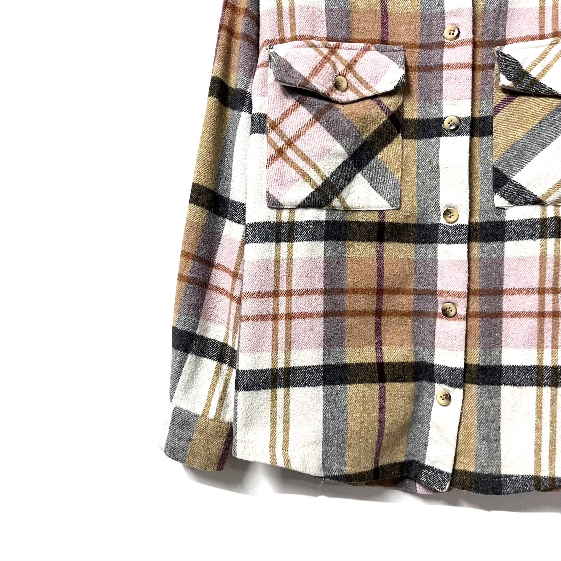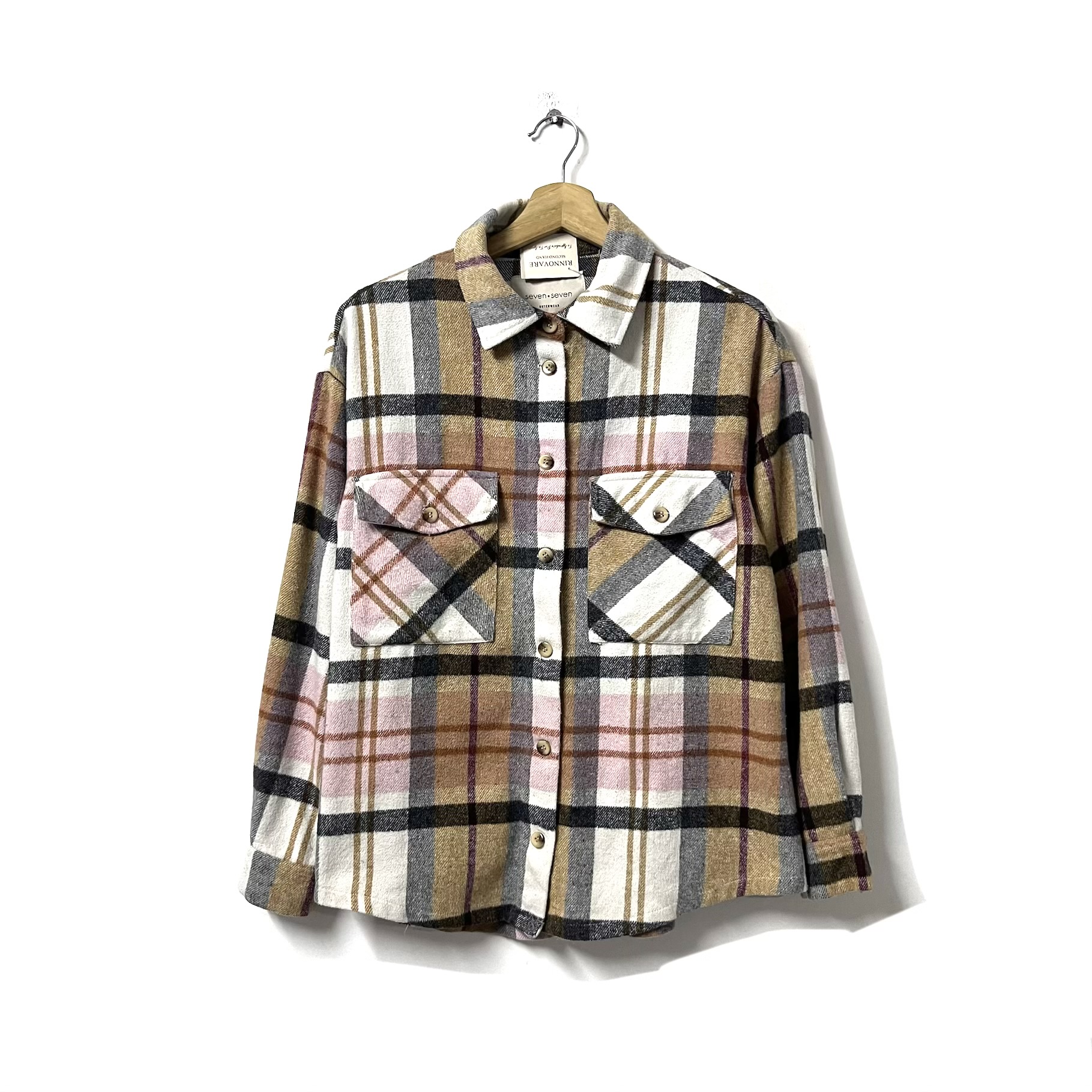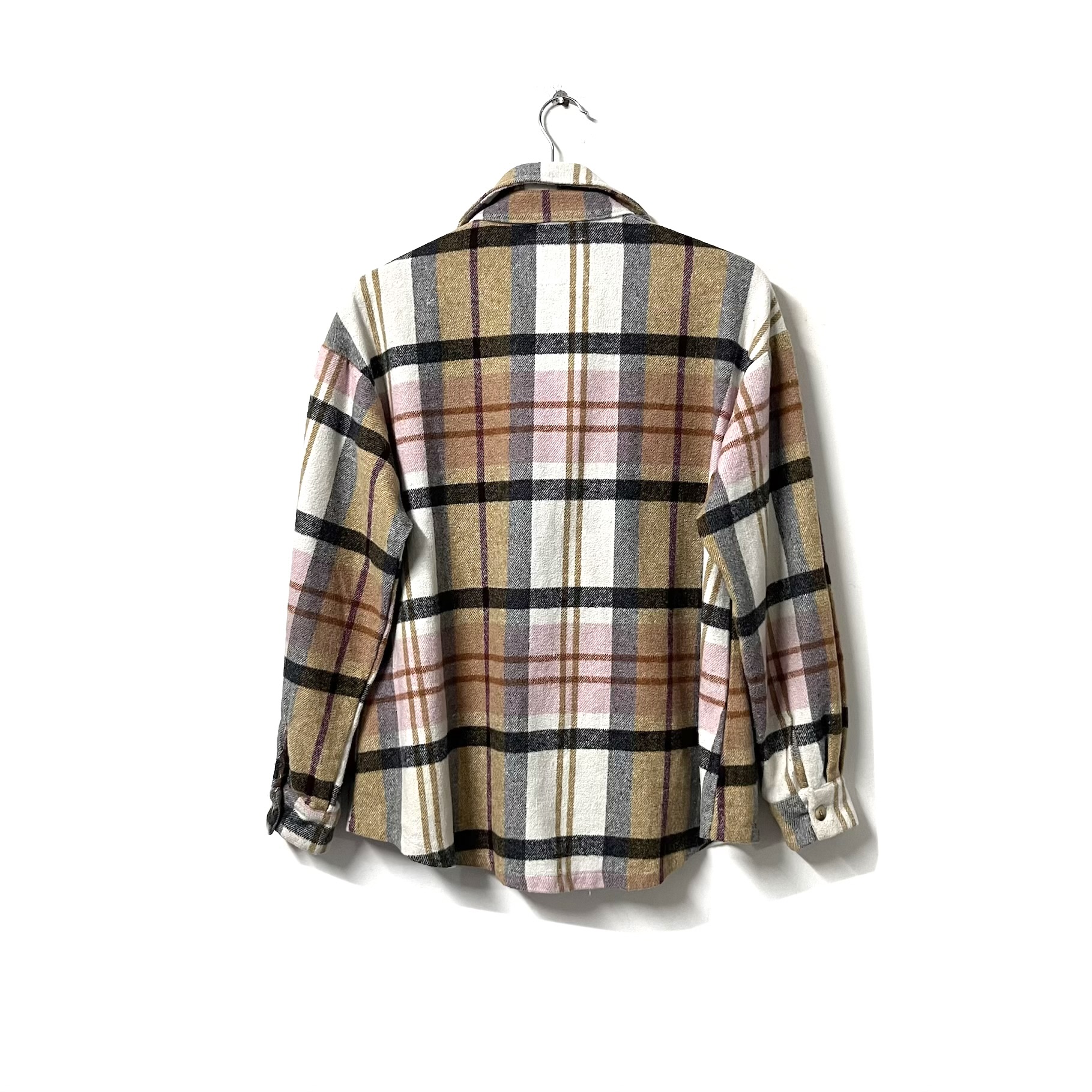 Sobre camisa a cuadros diseño en tartán. Colores en líneas café, rosado, gris, blanco. Tela en paño ligero.